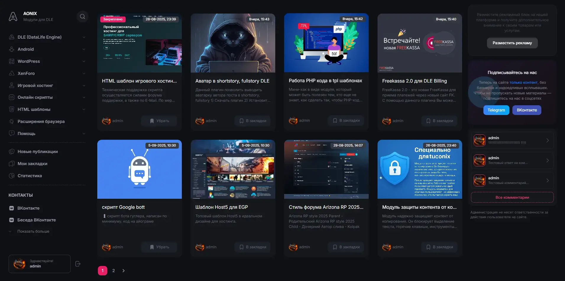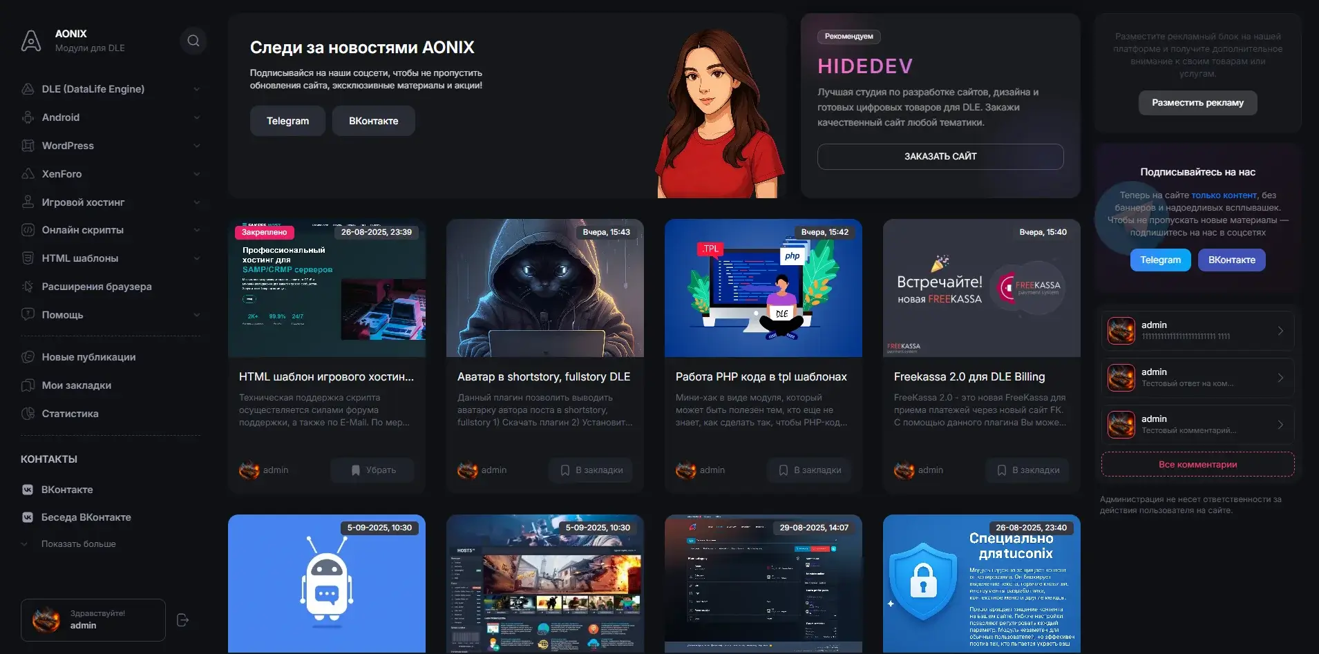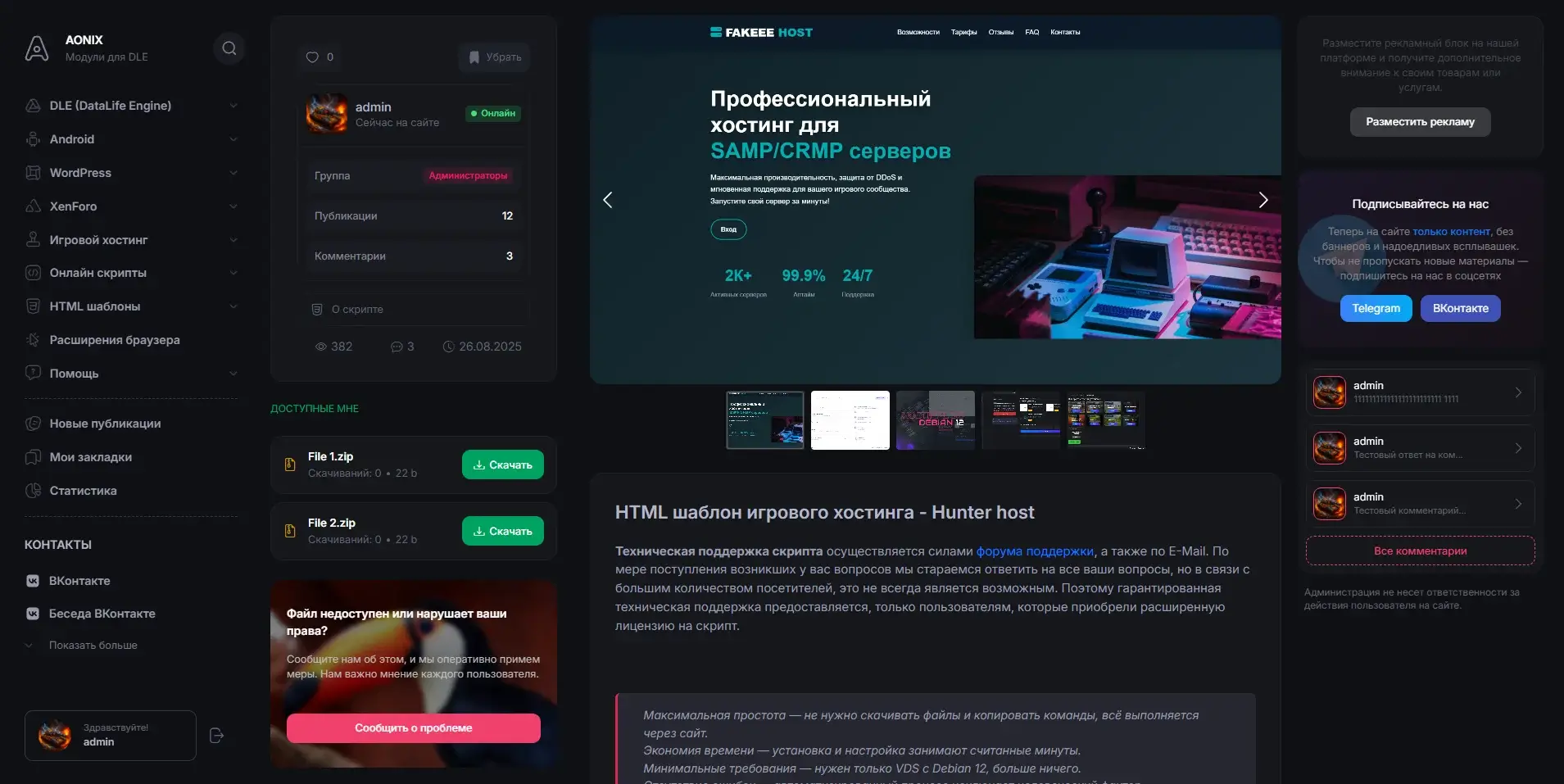 Aonix - простой и быстрый шаблон для организации порталов и каталогов на базе DLE. Из коробки сайт уже готов к работе, а установка занимает считанные минуты. В комплекте с шаблоном идёт простой плагин для подсчёта новостей на сайте. В шаблоне реализованы все основные страницы, проработана скорость и мобильная версия.