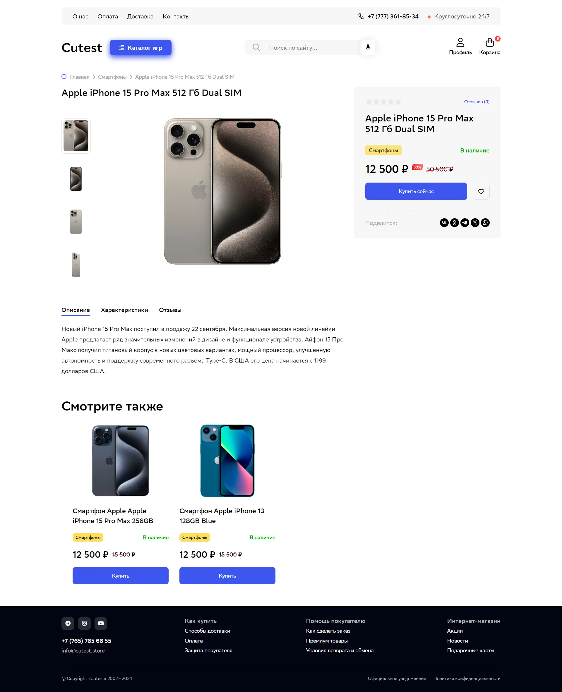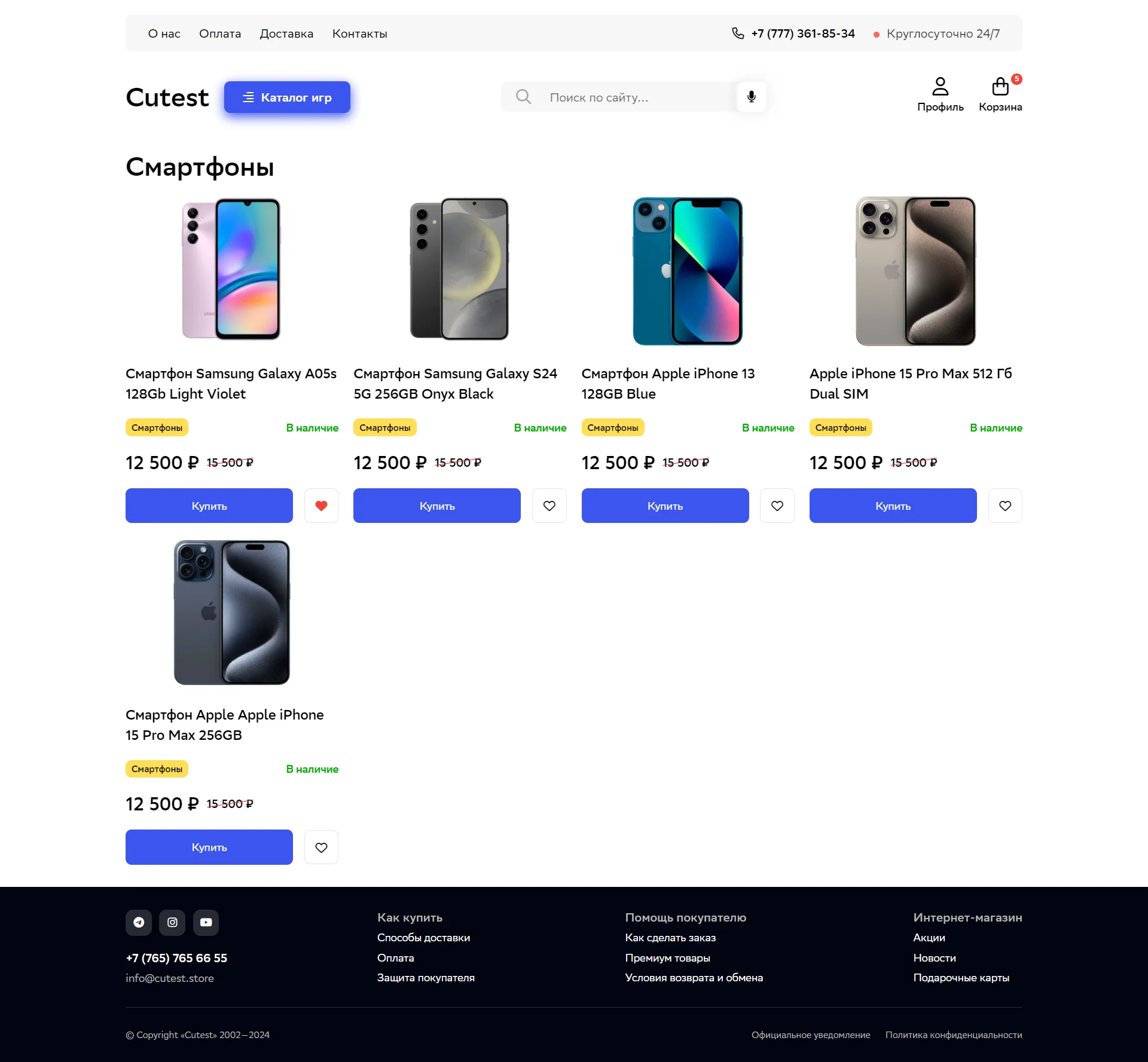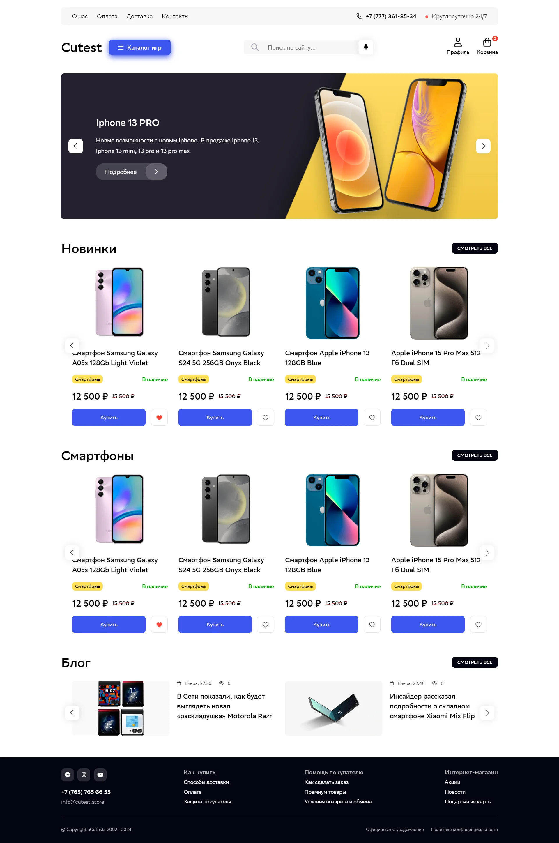 Cutest — шаблон для интернет-магазина мобильной техники, выполненный в светлой теме с фиолетовыми кнопками с тенями. Отличается современным дизайном и был топом продаж в 2022 году.