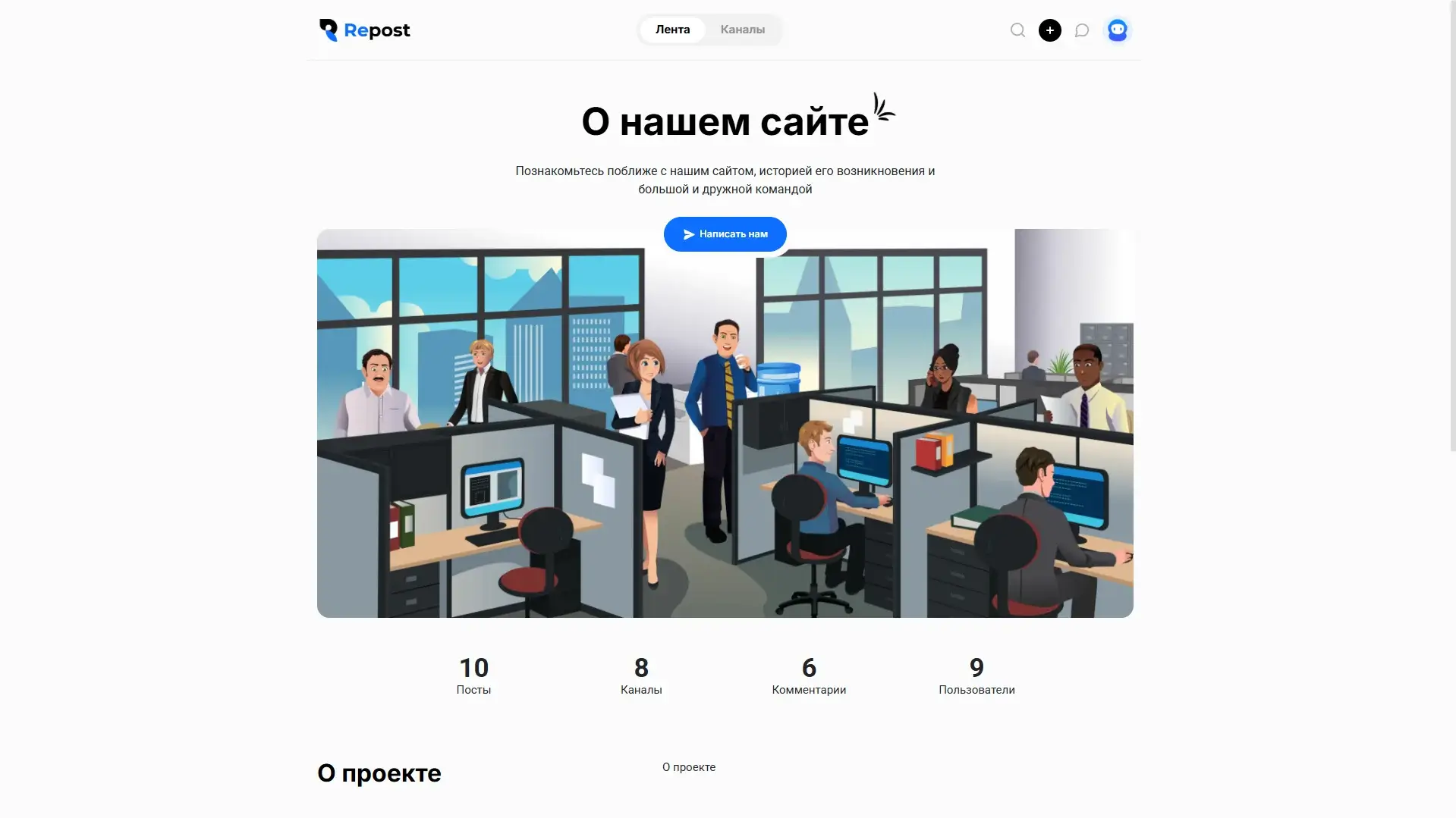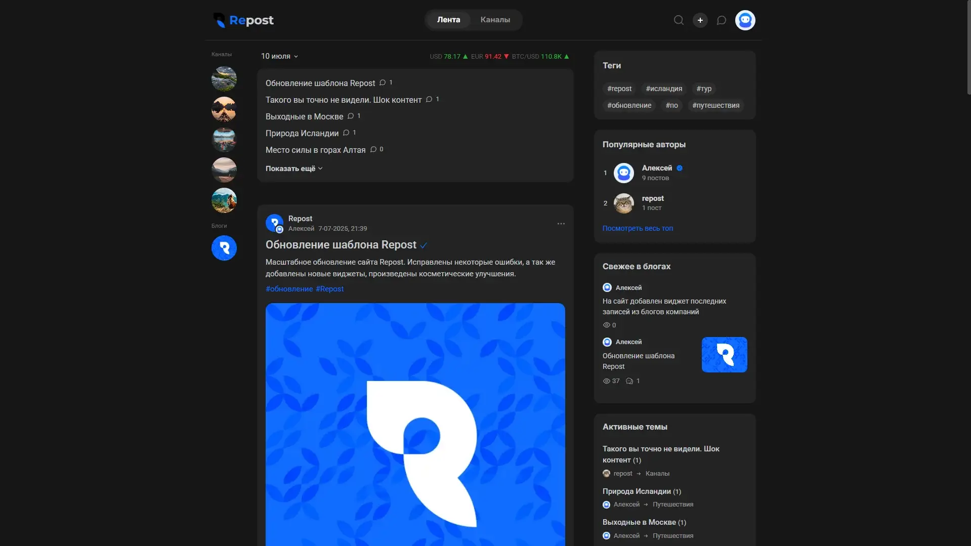 Минималистичный шаблон для построения сообществ с упором на локации, категории, работу с медиа. Repost позволит сразу же после установки организовать полноценную песочницу для разнообразных тематик сайтов. Из коробки предоставляется полный набор плагинов, необходимых для правильной работы шаблона, а так же расширяющие функционал и улучшающие визуал.