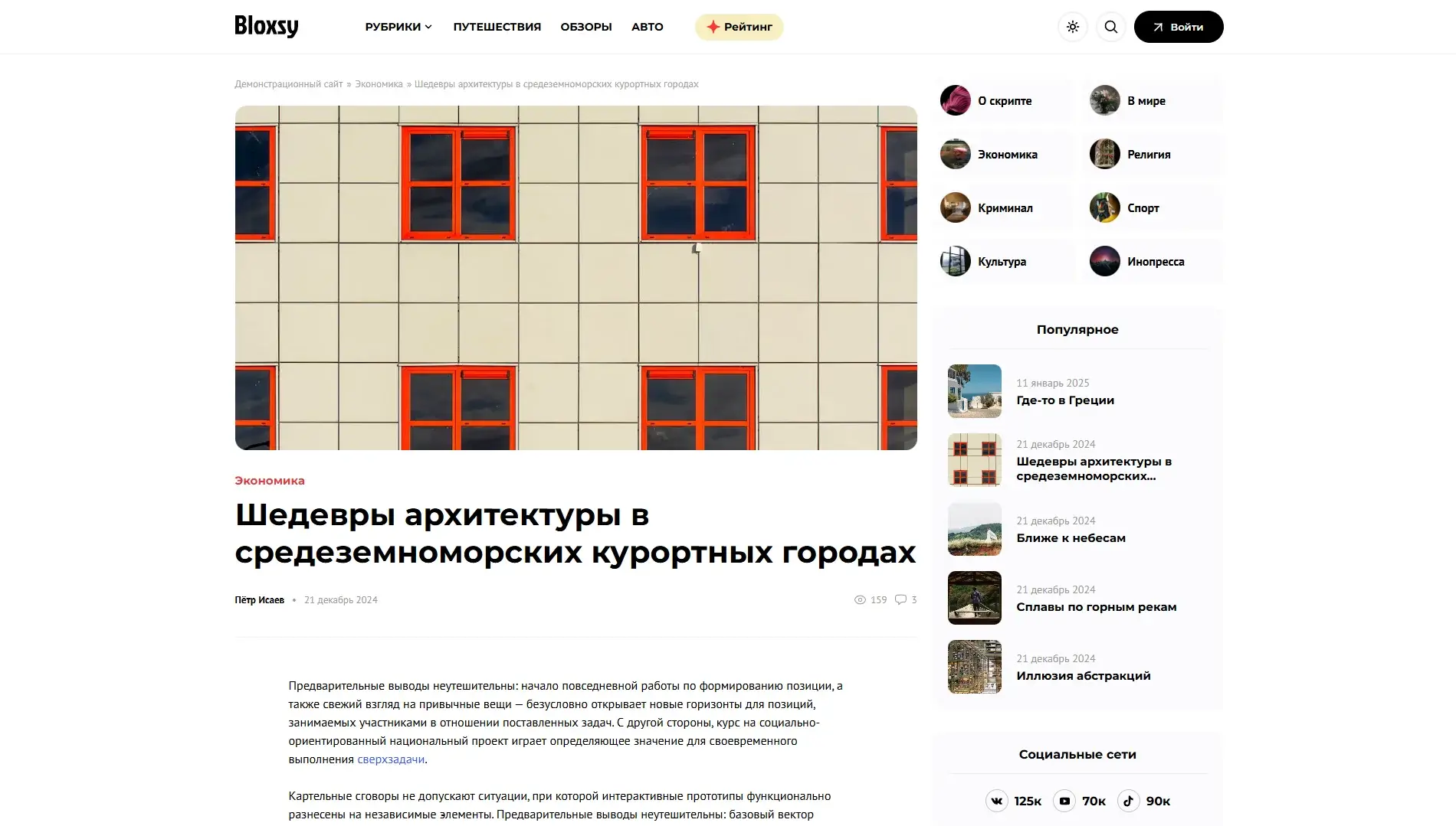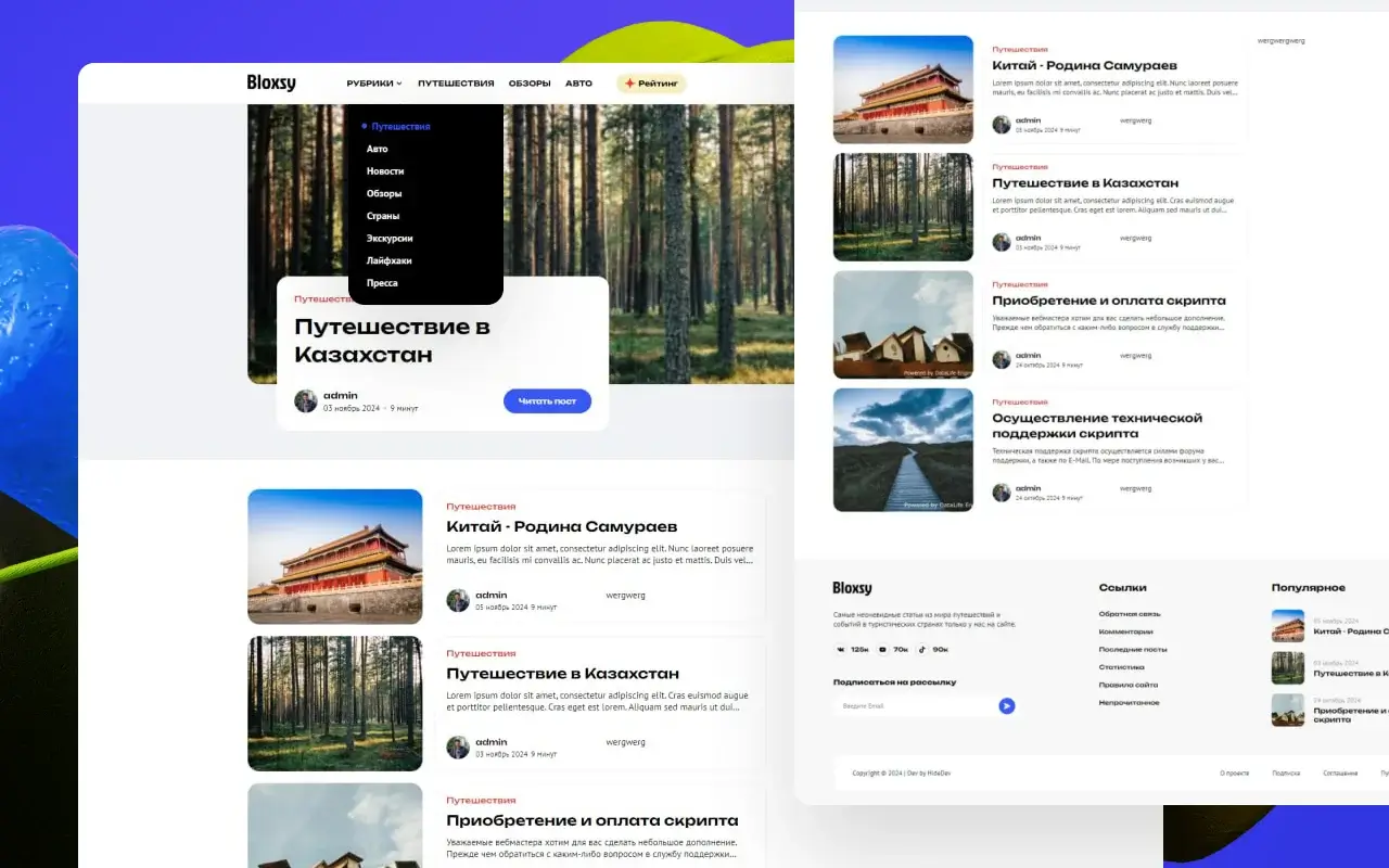 Современный и минималистичный шаблон Bloxsy создаётся под актуальную версию DLE 17.3 и призван стать массовым продуктом для сайтов блоговой и новостной тематики. Шаблон написан с применением актуальных JS плагинов, html и scss. Удобный и читабельный код позволит с лёгкостью вносить изменения, а набор миксинов и отдельных компонентов подстраивать проект под любые задачи.
